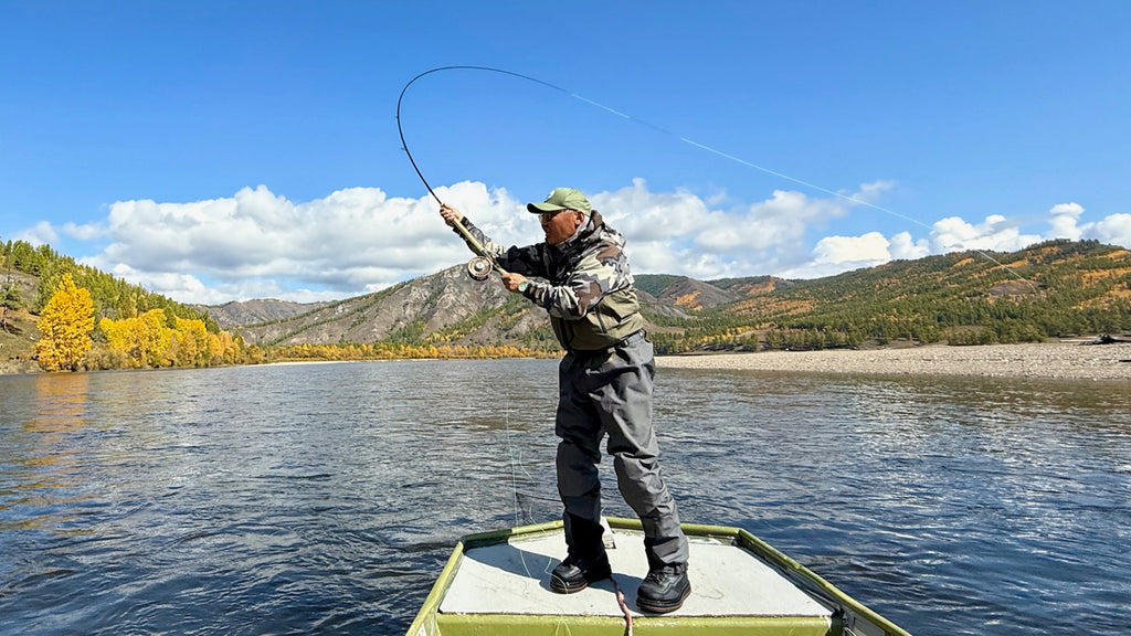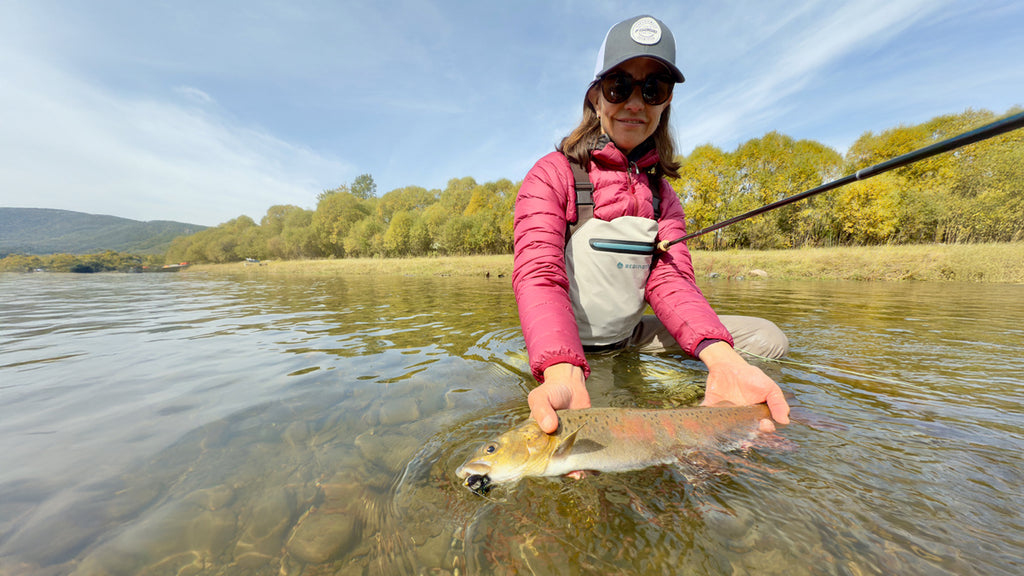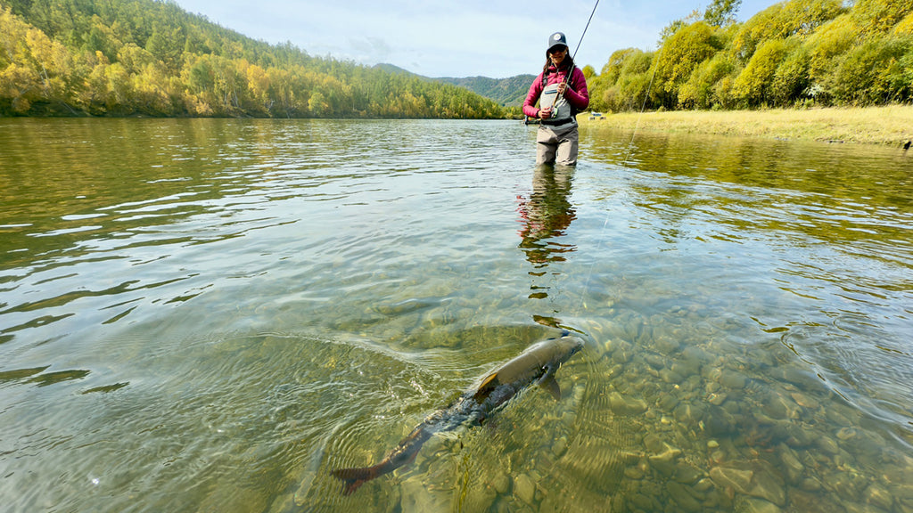 I had a day on this trip where I landed more taimen than I did in the entirety of my previous trip! While we didn’t find any true monsters, we caught good numbers of fish between 30 and 37 inches and just knowing that each cast has the chance at raising a 50-inch fish makes things very engaging. My wife cares little for blind casting large flies, so we did what I would recommend all visiting anglers do, which is to dedicate several hours each day to targeting lenok. Lenok are also known as the Asiatic Trout, and in many ways, they should be the headline species in Mongolia. On the Eg-Ur they run relatively large, meaning most of the fish you catch are between 16 and 22 inches, with the chance at larger ones. Better yet, they are rather numerous, and they are targeted with 5-weight rods and floating lines while wading. The wading is easy, and they can be caught on dry flies, dry dropper setups, and swinging a small black woolly bugger, which is deadly. Every time Mia spent time lenok fishing, she landed fish that were 18 inches or larger. Two of our guests, Mike and Tana Powel made the trip to Mongolia to exclusively fish for lenok, and they crushed fish all week. The guides like to fish 1x and 2x tippet for lenok, because they can get away with it and because catching taimen while targeting lenok is common. Mike “incidentally” landed roughly 10 taimen this week, all on a 5-weight rod, and most were more than 30 inches long. Despite not targeting taimen, he was one of, if not, the top taimen rod in camp! This was an eye opener for me and crushed some of my preconceptions about the fishery.