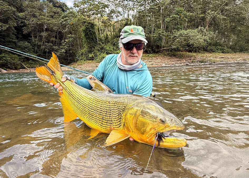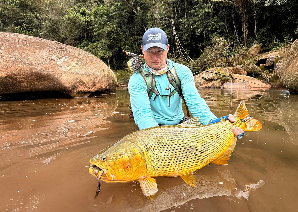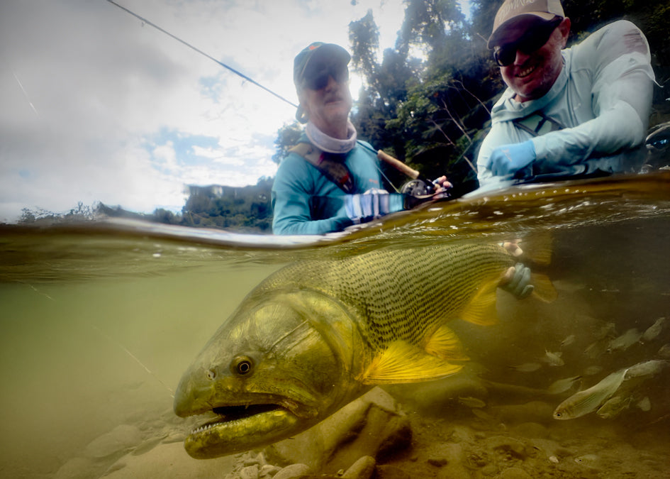 One of my favorite moments was photographing Dan land and release a 91 cm golden dorado. It was the largest dorado I had ever seen in person. Shortly thereafter, while still buzzing, I cast across a bunch of fast water and was stripping my fly through some slower flow structure. As my fly entered the seam, it was really moving, and behind it I saw a big golden face and shoulders chasing the fly. I could see its eye clearly, and it looked fiercely intent on getting my fly. I kept stripping, and after chasing it at high speed, straight downstream for 40 feet, it caught it! It fought really hard, and after we released it, a rain squall moved in and cooled us off after all the action.