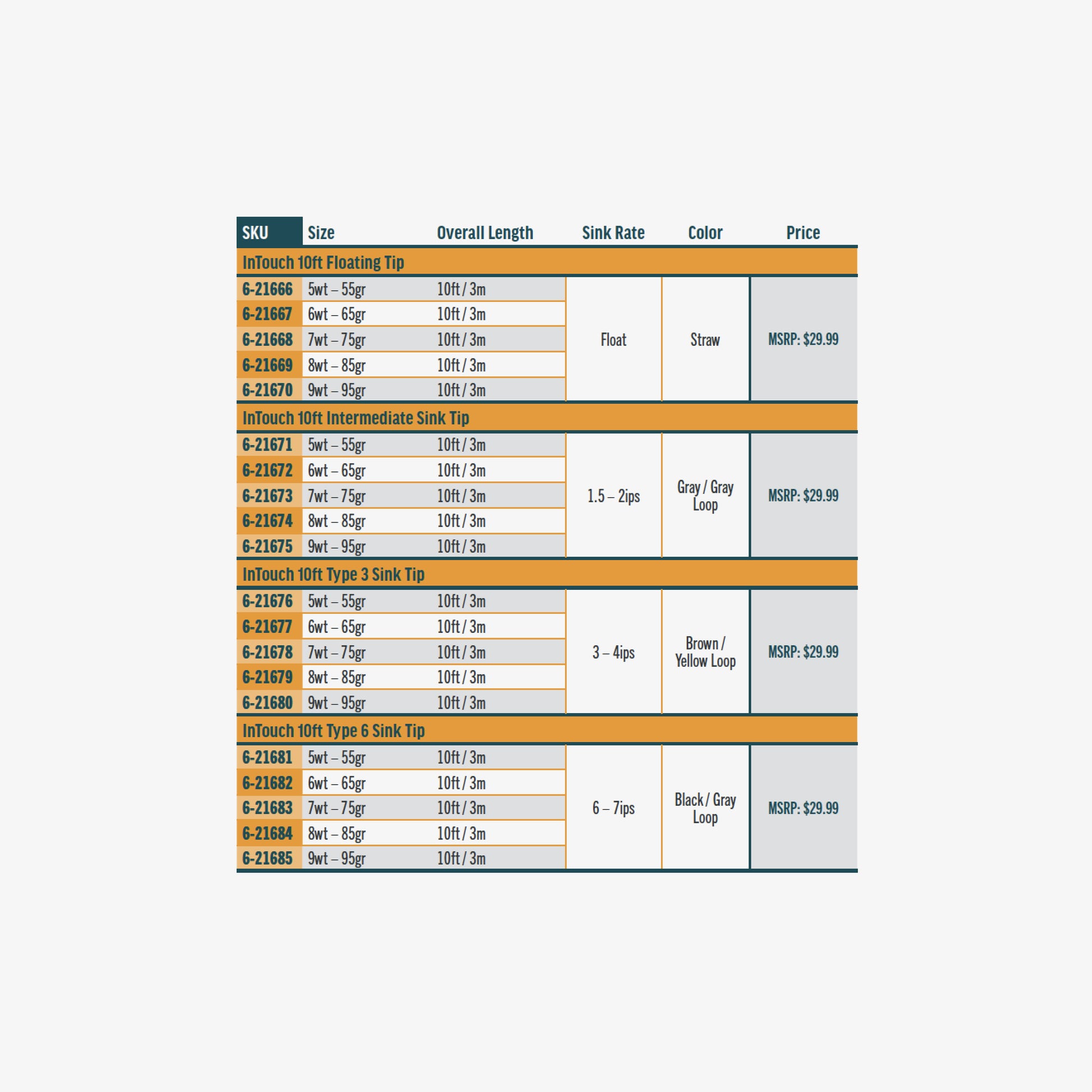 These tips are 10ft long, and have a steady front taper of about 3ft, which allows for good presentation of a fly. Each tip has a color coded loop at the rear, and is printed with the tip size - attach the printed end to the fly line. The tips are built on RIO's ultra-low stretch ConnectCore for the maximum in sensitivity and performance, and are density compensated at the front end (not the intermediate) for the best fishing performance.