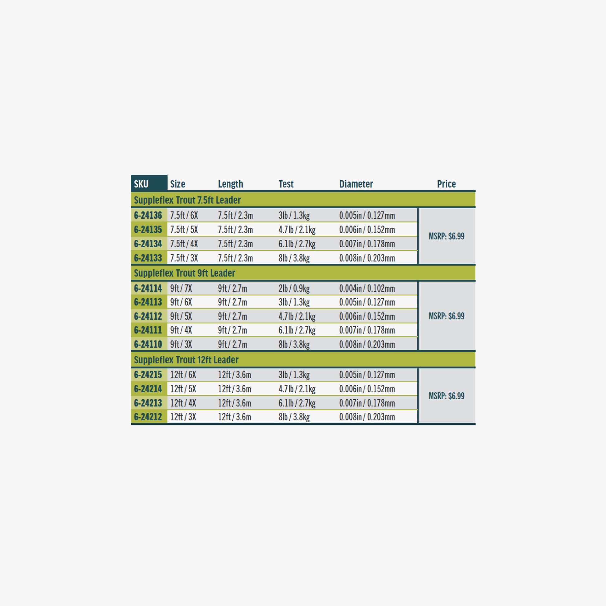 The supple nature of the material gives featherweight presentations and does not impede the natural movement of a fly in the current. These leaders are a perfect choice for the dry fly and soft hackle fly fisher. There are three leader lengths available: